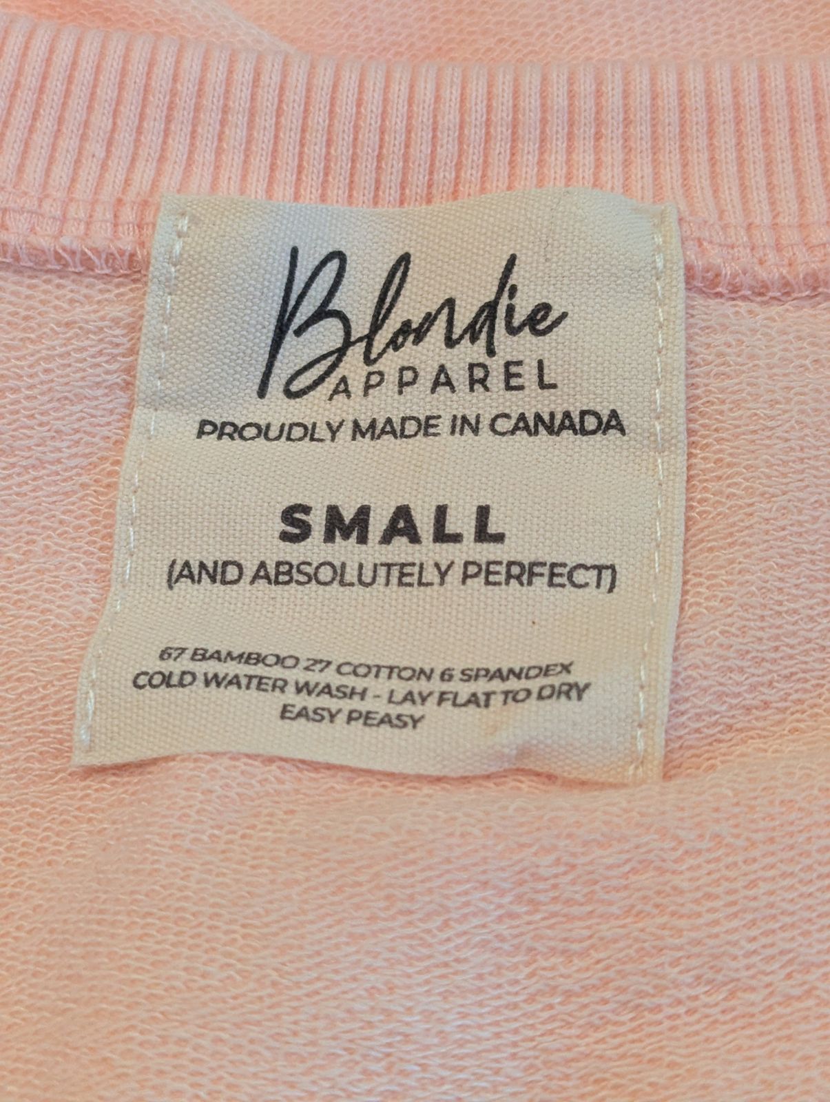 I bought this sweater in peach and white; they are both so cute. The fit is quite roomy in the torso and snug on the arms, but the arms are still comfortable. I'm usually between a small and medium and I sized down for this sweater. I might size up next time depending on how fitted the arms are. The fabric is so nice, and I love the adorable Blondie tag! I'm new to Blondie and will be a dedicated customer going forward. :)
